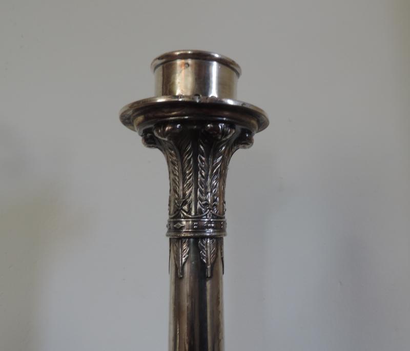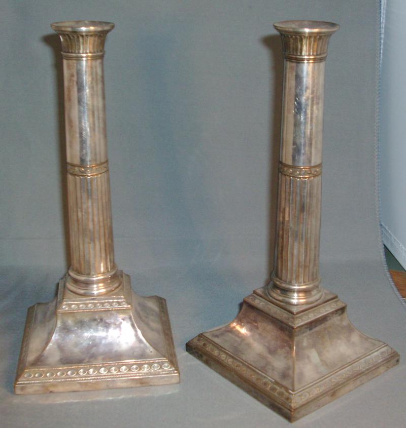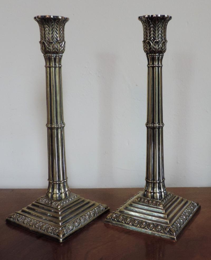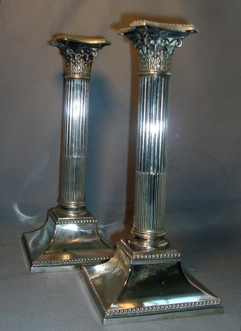 Pair Old Sheffield 19th century Corinthian column candlesticks measuring 10" tall. Hallmarked H.E.&Co. for Hawksworth, Eyre and Company.