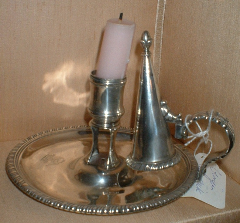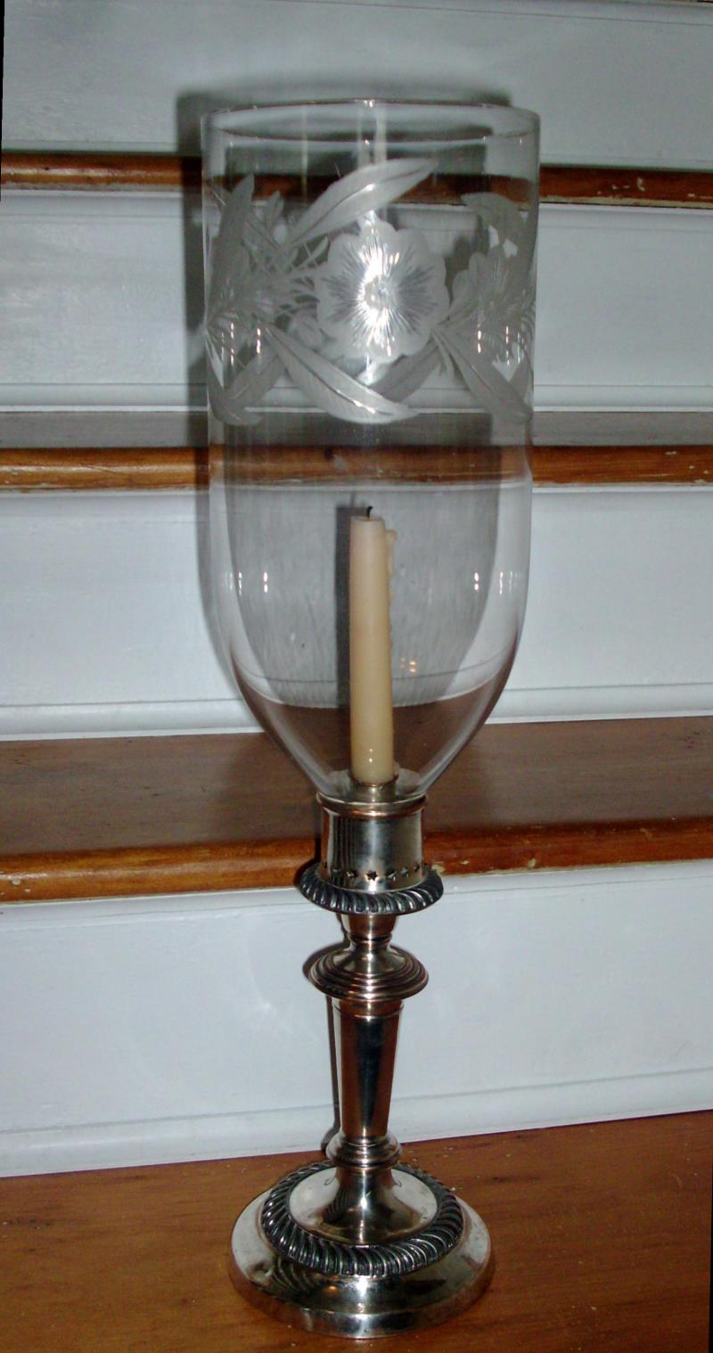 Large early 19th century old Sheffield silver on copper hurricane candlestick with finely etched shade. Measures 22.5" tall.