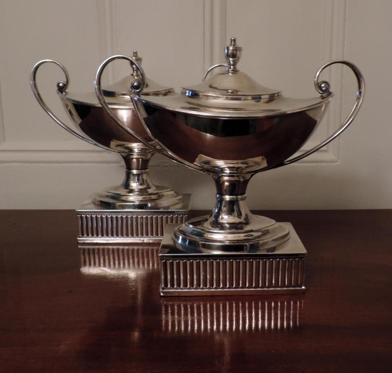 Pair 18th c. Old Sheffield covered urns on weighted bases - perfect mantle decoration.