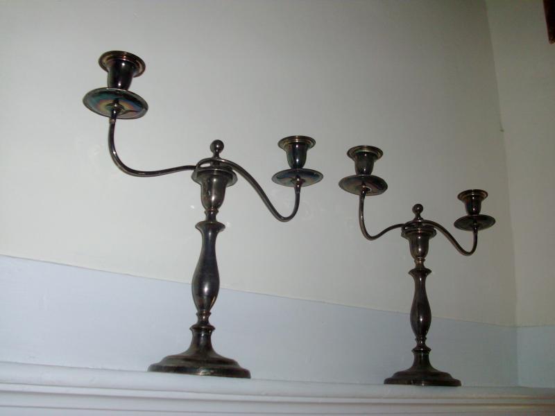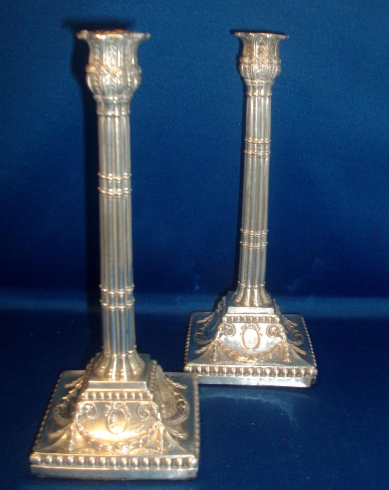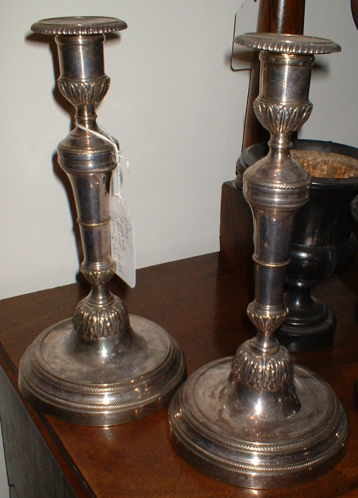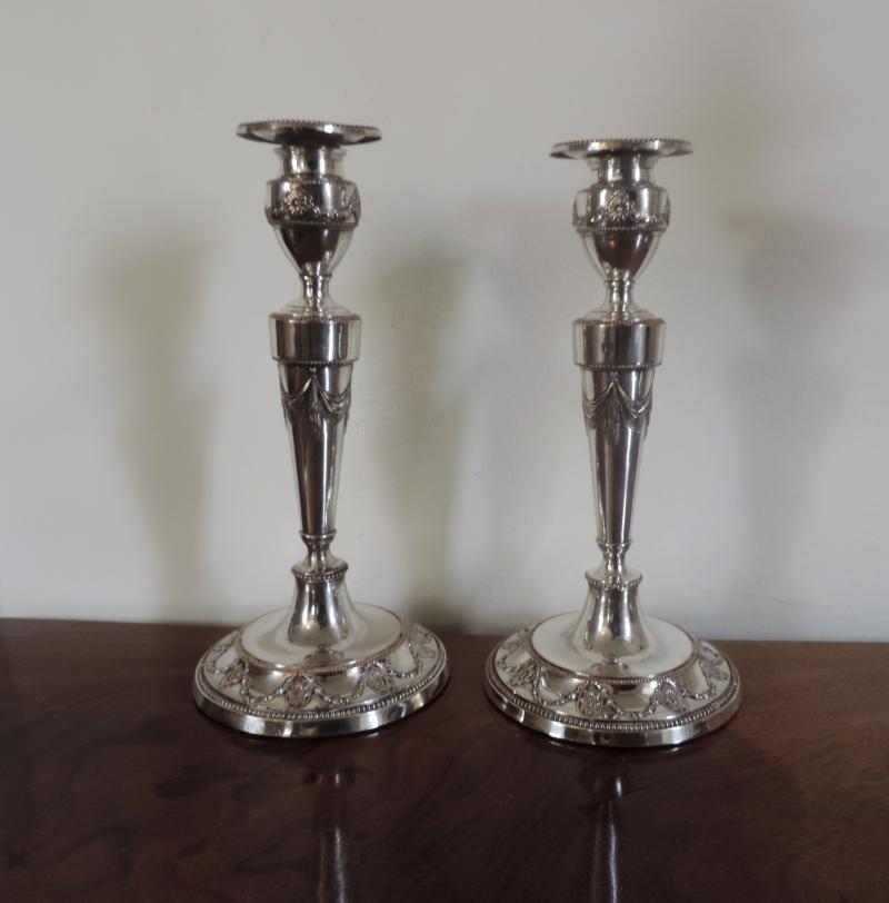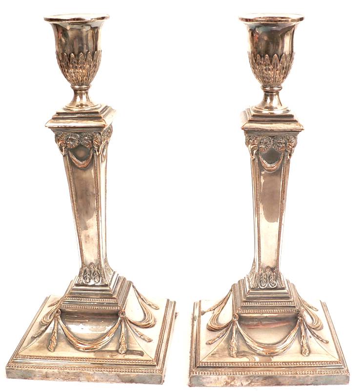 Pair late 18th c. old Sheffield silver on copper candlesticks in the Adam taste decorated with paterae, flower heads and drapery swags.