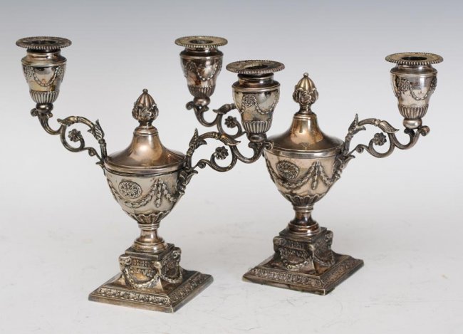 Pair 19th c. Sheffield silver plate urn form candelabra.