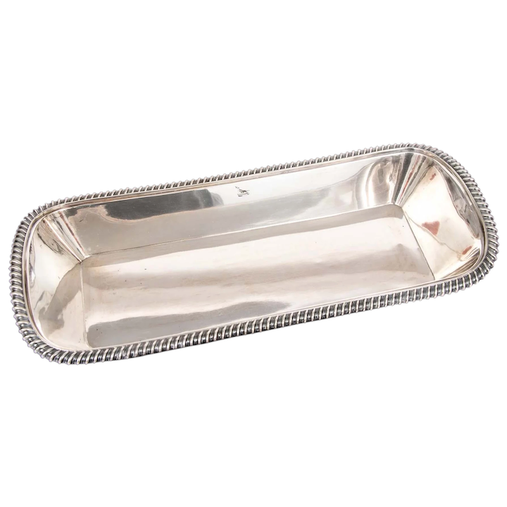 Large old Sheffield silver on copper knife or bread tray with engraved dove crest.