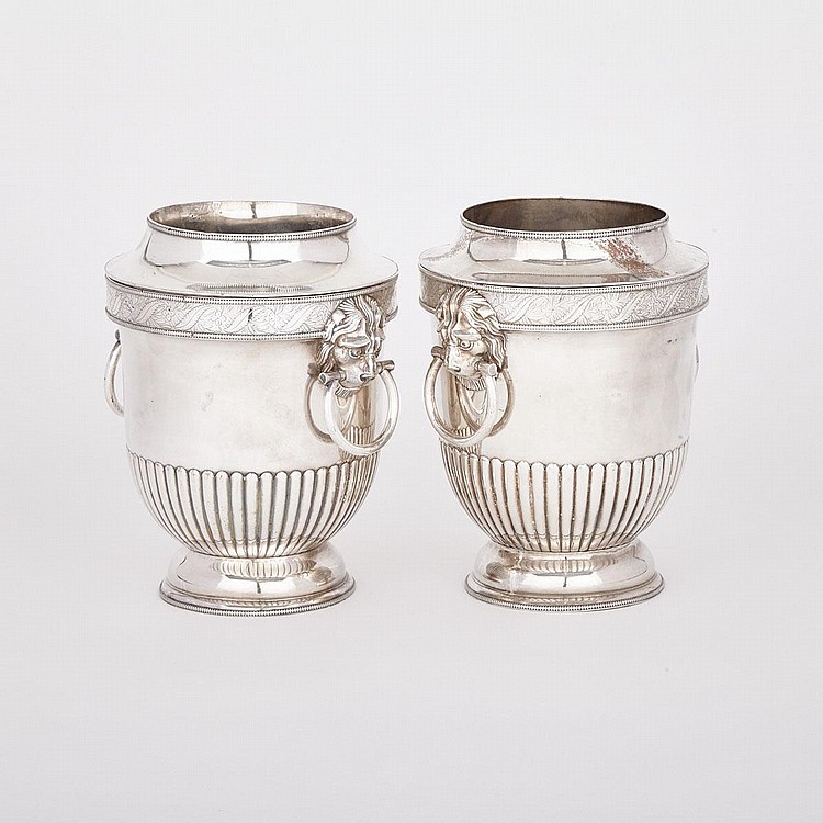 Good pair of early 19th c. English Regency Old Sheffield silver on copper vase form wine coolers with gadrooned foot and lion mask ring handles c. 1810.