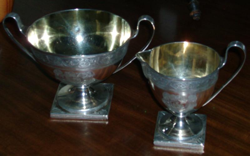 Bright Cut Sugar & Creamer with vermeil wash and heraldic crest, fully marked, heavy weight.