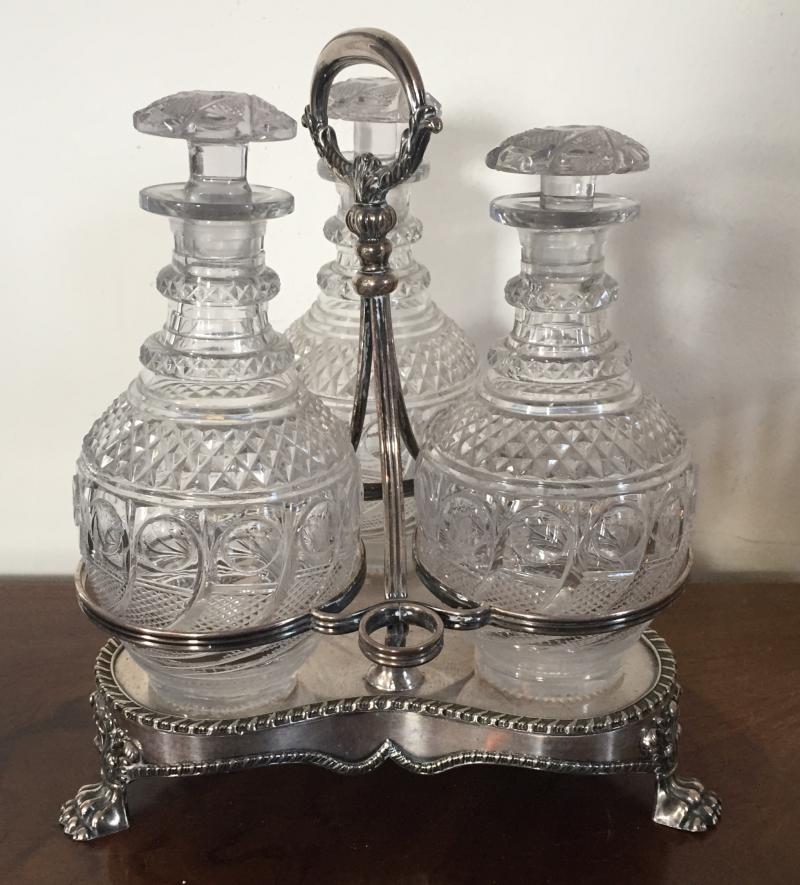 English Regency old Sheffield silver on copper tantalus stand with three cut crystal decanaters.