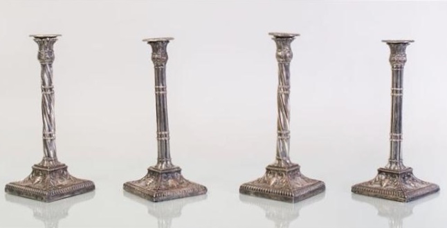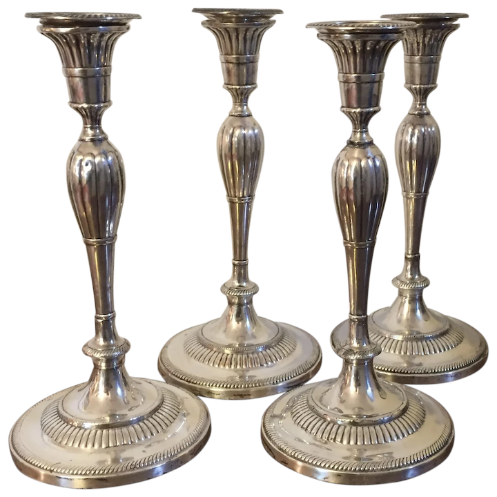 Set four large George III old Sheffield silver on copper candlesticks with reeded stems, foliate nozzles and urn decorated bases.