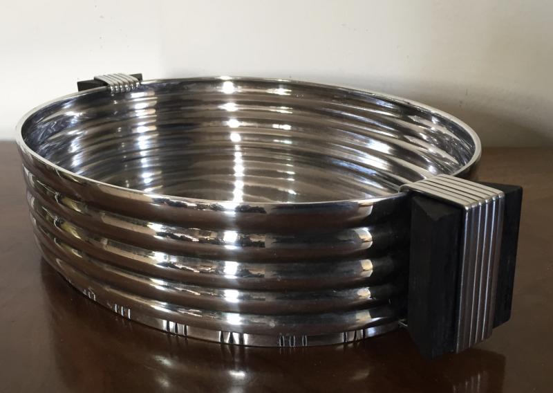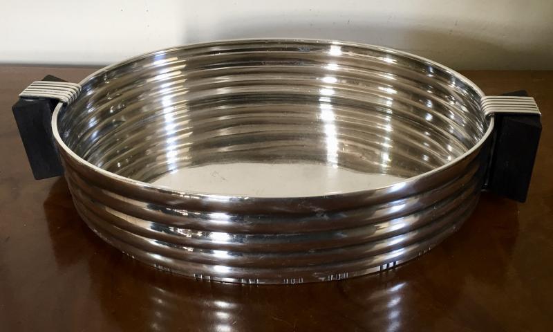 Art Deco silver plate galleried tray or centerpiece bowl with exotic wood handles c. 1920's.