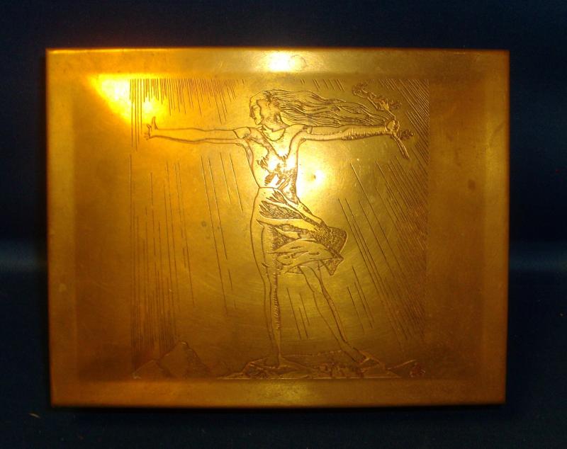 Art Deco brass cigar box by Rockwell Kent for A.G. Spalding c. 1928. Image depicts Kent's wife Sally.