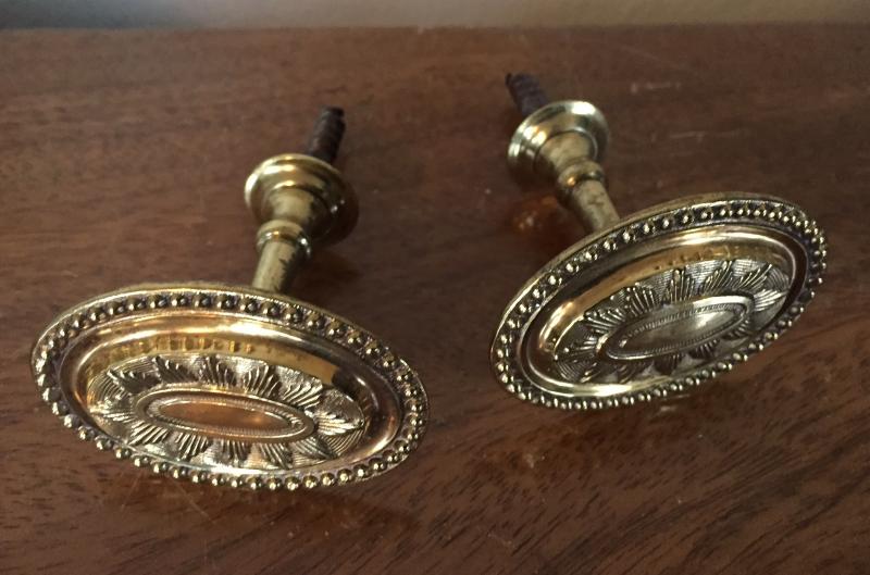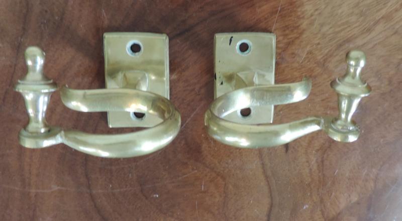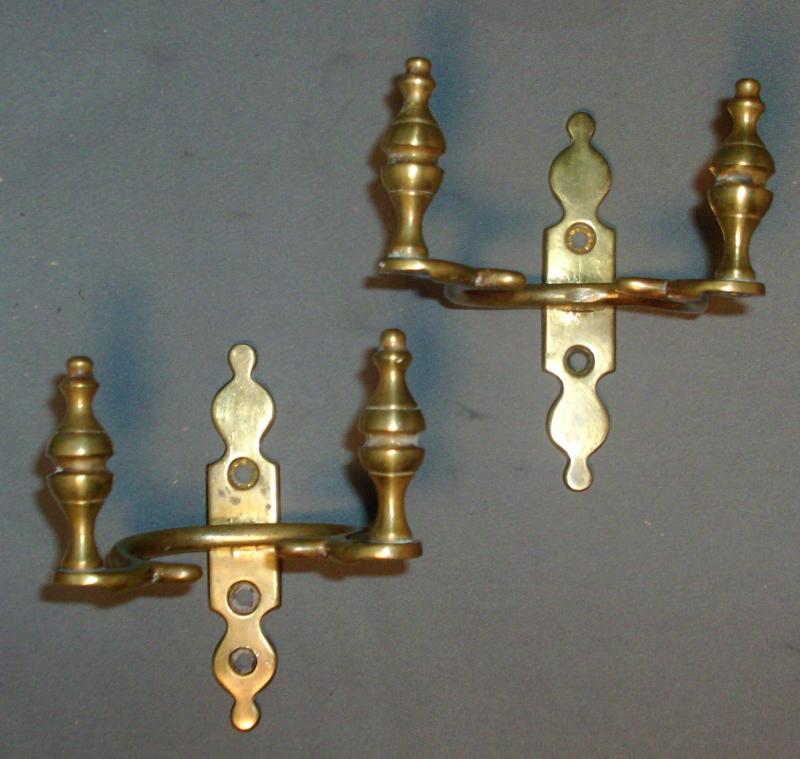 Federal brass jamb hooks with urn finials - mounted on the mantel and used to hold fire tools.