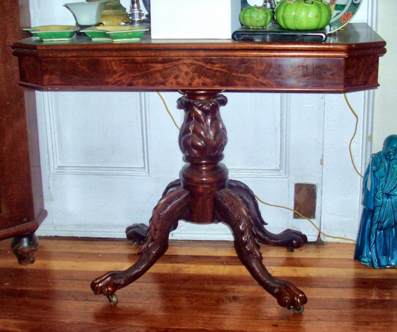 New York Classical Breakfast Table with two drawers, fine acanthus carving on legs, highly figured mahogany, fitted claw castors and original hardware c. 1810.