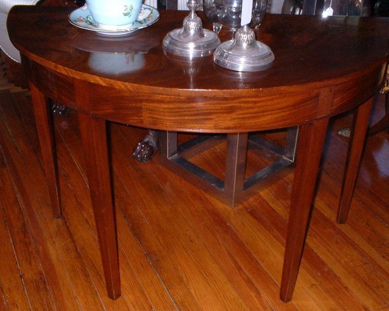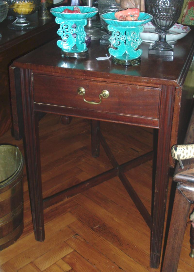 Federal Pembroke Table with highly figured mahogany, tapered Marlboro legs, x-base stretcher, beaded drawer with bail handle. A nice example of this form with good surface.