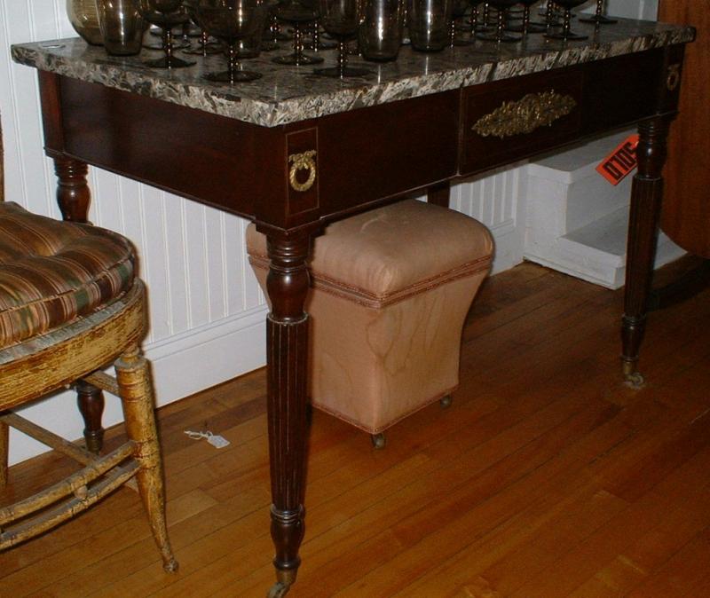 Philadelphia Federal Pier Table with original highly figured marble top, reeded legs and gilt brass trophies all on castors c. 1810.