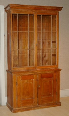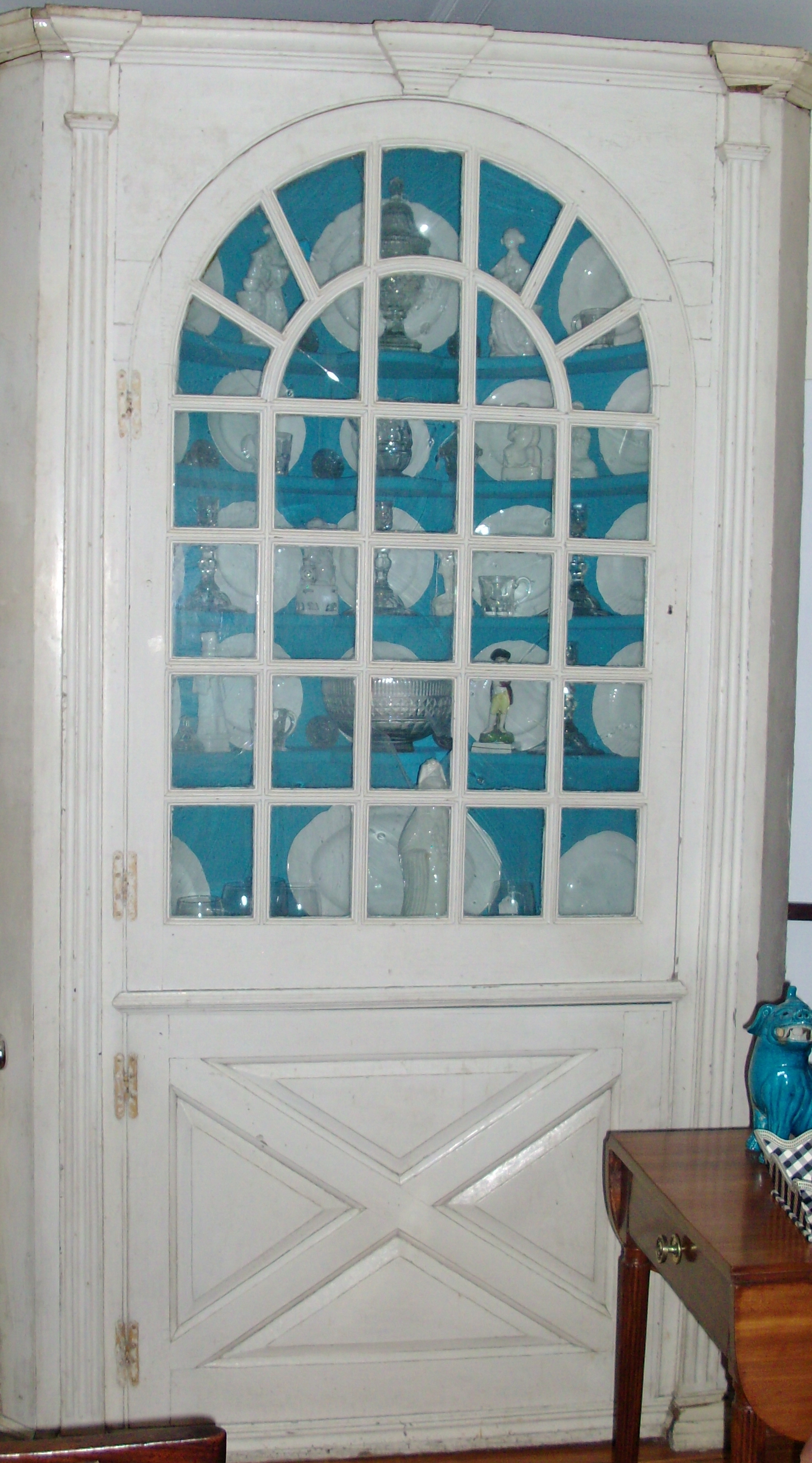 Chippendale Corner Cabinet with raised panel door in the "Connecticut Cross" pattern below 30-lite glazed door. Paneling and front facade all original 18th c.