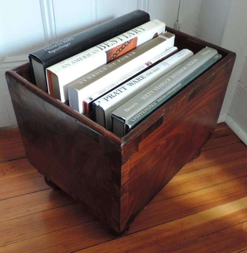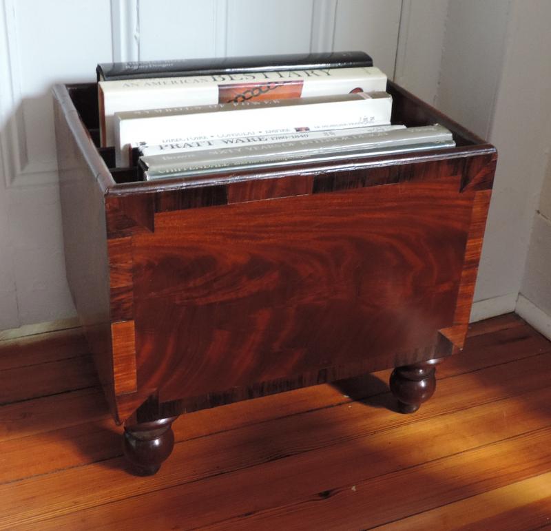 American classical mahogany library canterbury with rosewood cross banding and brass cap ball feet. Attributed to Duncan Phyfe, New York 1825. Perfect caddy for organizing file folders beside a desk or keeping favorite books close to hand.