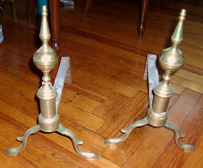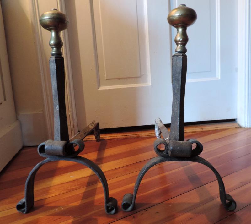 Pair 18th century American Queen Anne colonial wrought iron andirons with cast brass finials.