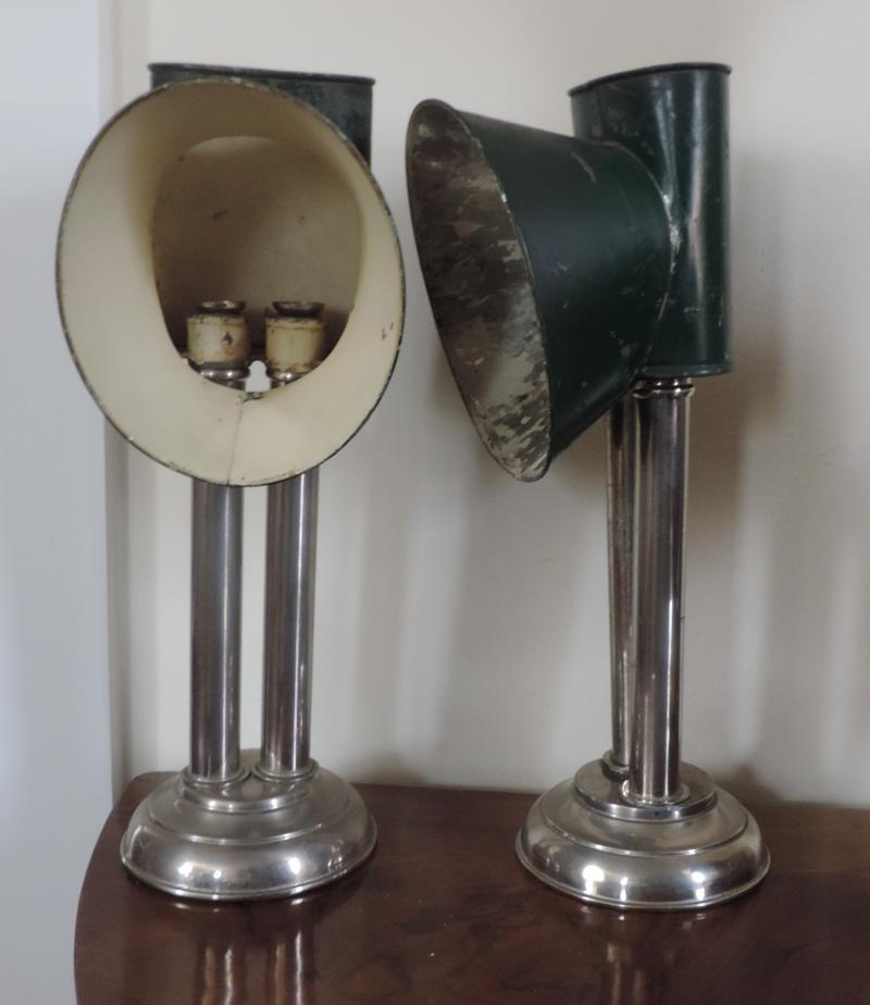 F. A. Walker & Co. Boston double candle nickel banquet or library desk lamps with green tole shades - 19th century.
