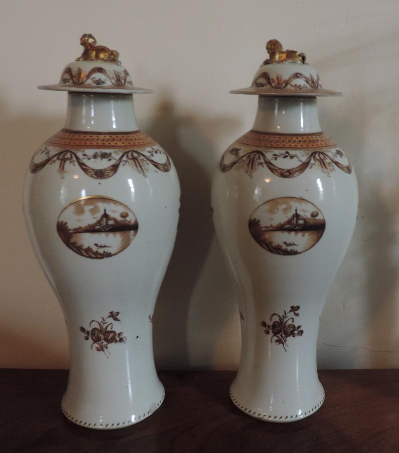 Large pair Chinese export porcelain mantle garniture urns for the American market decorated en grisaille in sepai tones with salmon bands.