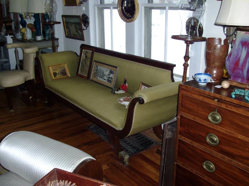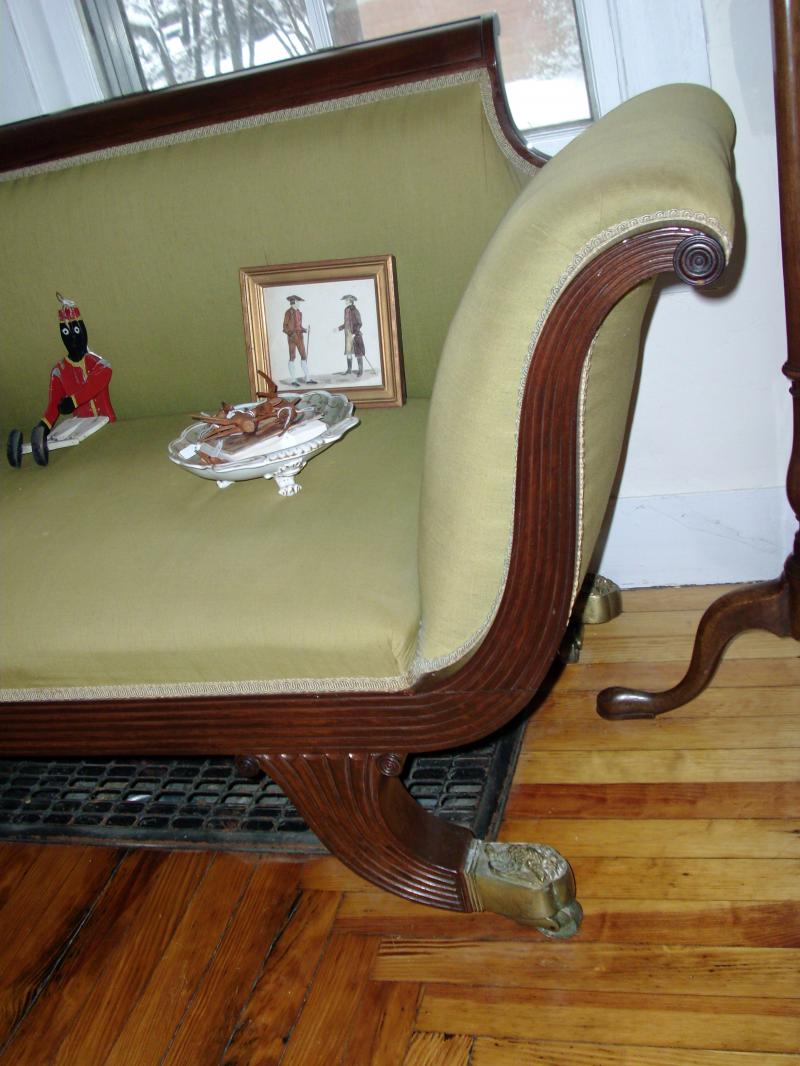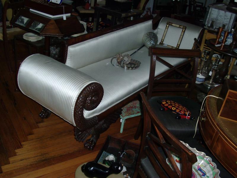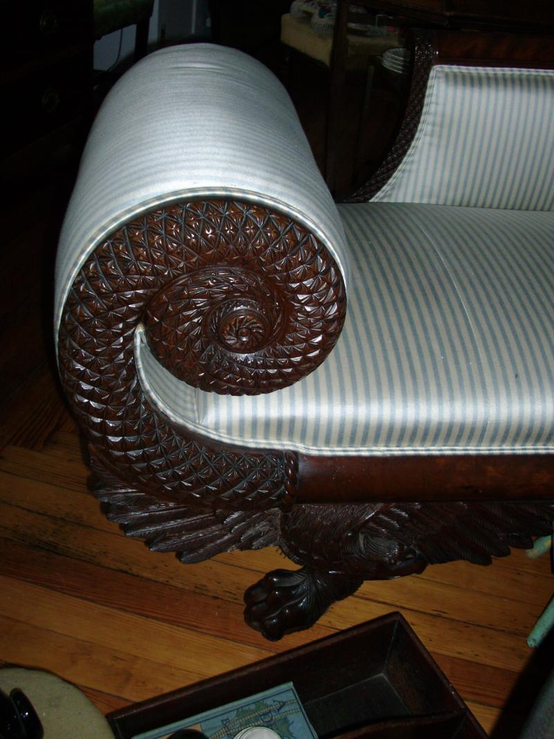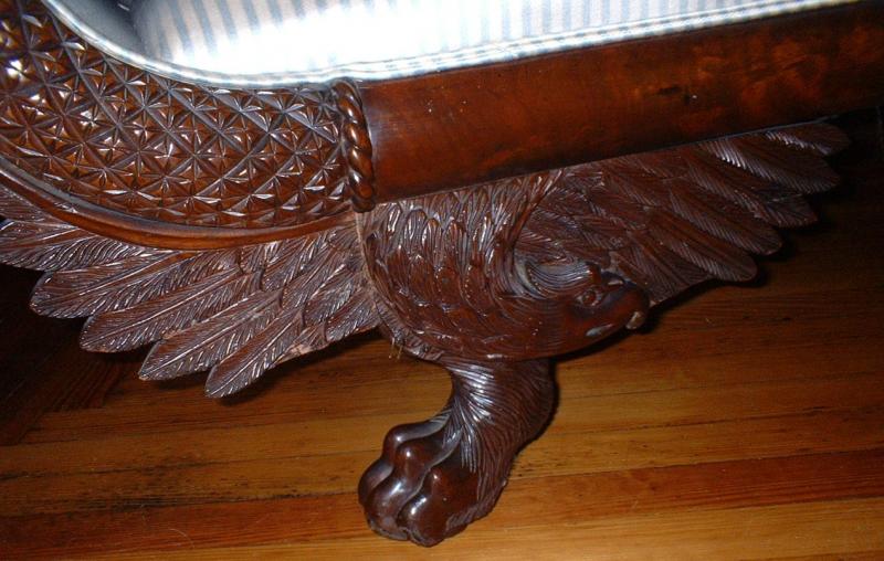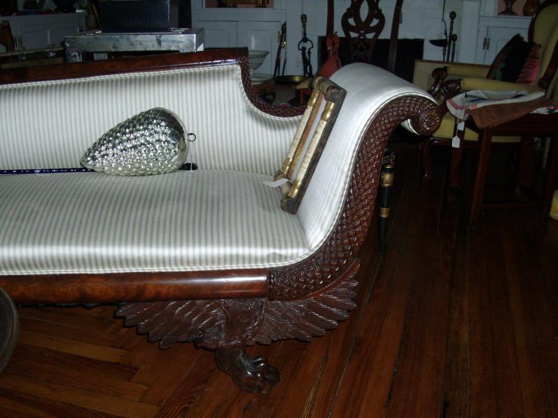 Fine New York Classical Recamier with full eagle carvings and feathers, canted back, highly figured mahogany and claw feet c. 1815. Museum quality. Measurements: 30.5" high x 92" long x 24" deep |