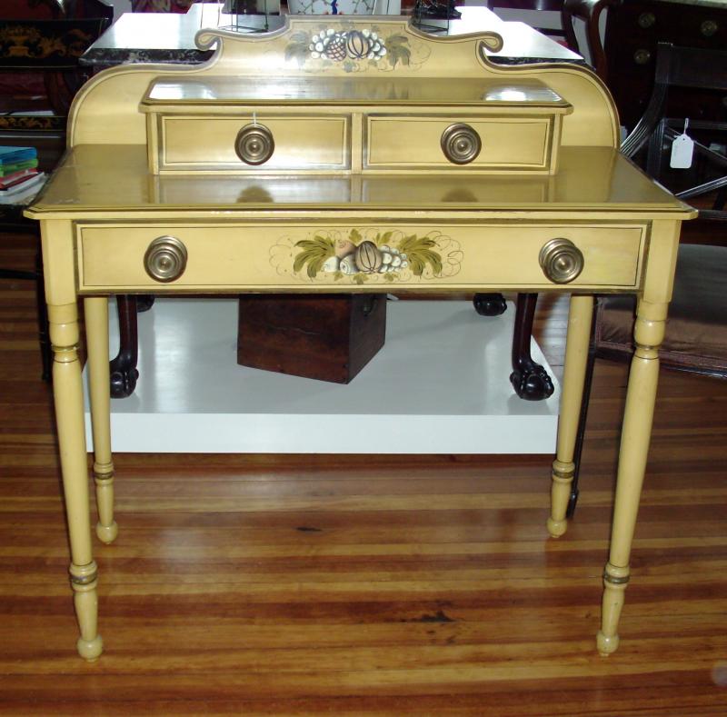 Connecticut Paint Decorated and Stenciled Dressing Table in chrome yellow c. 1830 with original spun brass pulls.