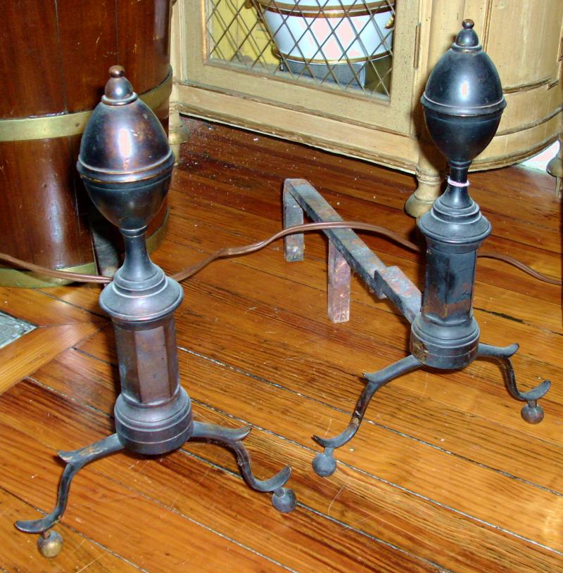 New York Lemon Top Federal Andirons with octagonal shaft, ball feet and great patina.