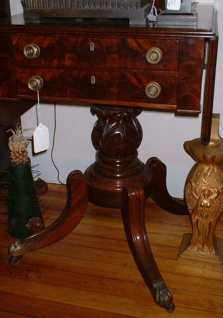 Classical New York Work Table and Deskwith fitted interior, extending side flaps, acanthus leaf support and reeded legs on castors c. 1815.