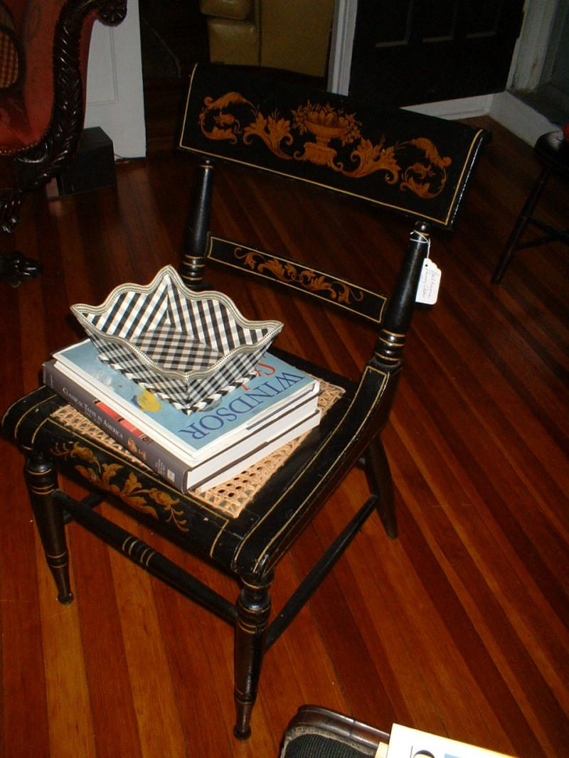 Bookcase Cabinet with original glass mullioned doors, elegant proportions and classical pediment c. 1830. Measurements: 86.5" tall x 51.5" wide Baltimore Paint Decorated Klismos Chair c. 1810. Measurements: 32" high |