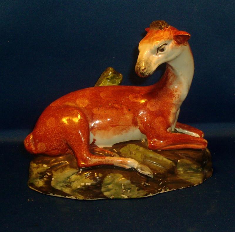 Pair 18th century Derby porcelain stags at lodge c. 1765.
