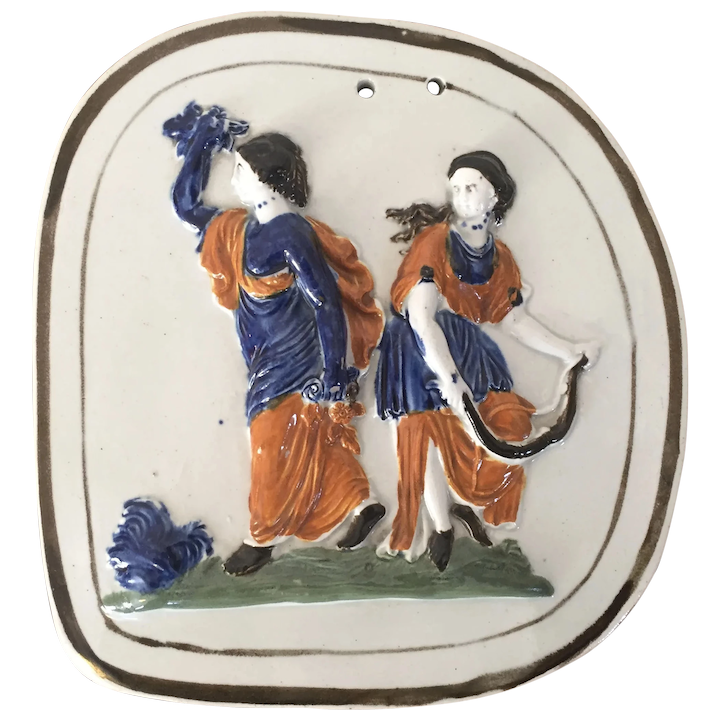 Pair prattware relief molded wall plaques with recumbent lions - early 19th c.