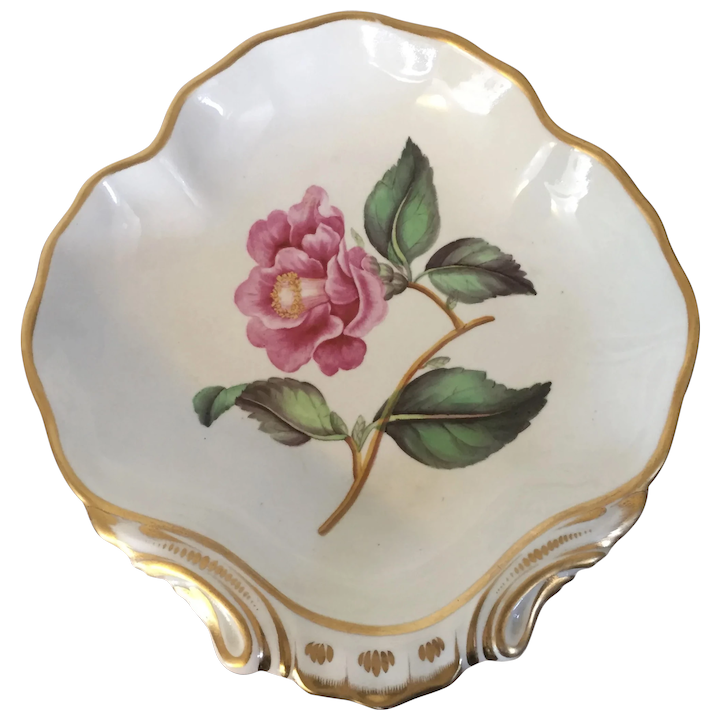 Derby porcelain shell shape botanical dishes decorated with named specimens.